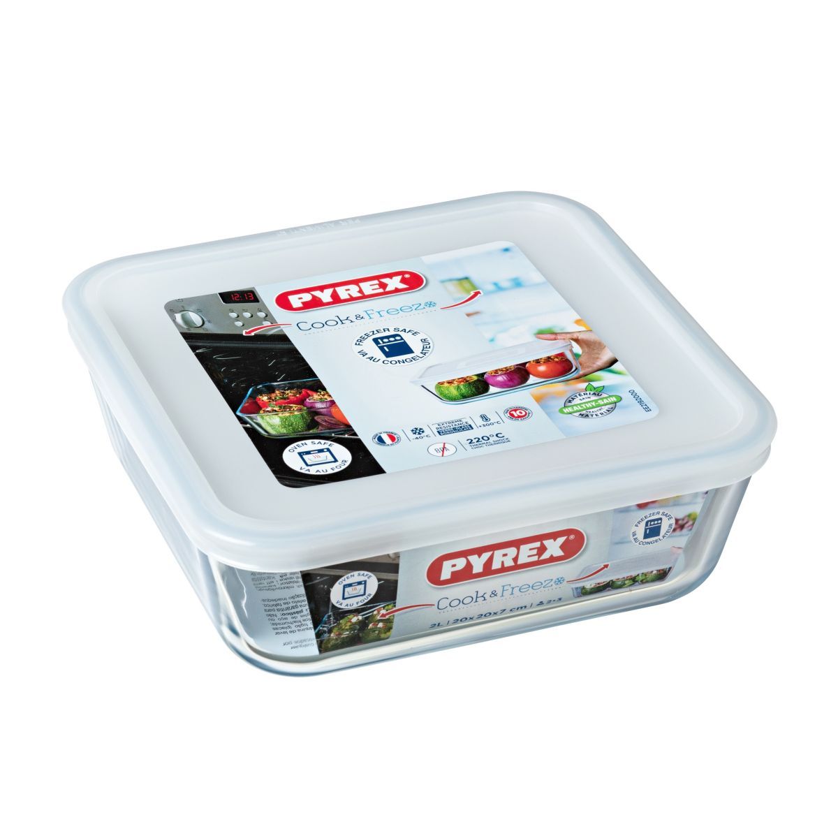 Une boîte carrée PYREX en verre borosilicate (un verre très résistant aux températures élevées et aux chocs thermiques qui passe sans problème du congélateur au four). Parfaite pour la conservation des aliments au réfrigérateur avec son couvercle bien hermétique, elle est super pratique pour emporter son repas au bureau et c'est aussi un plat de présentation simple et élégant. Dim. 20 X 20 cm.