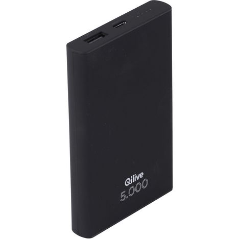 Batterie externe de secours Qilive ayant une capacité de 5 000mAh (cela permet de recharger le téléphone une seule fois). La batterie dispose d'une sortie USB-A et d'une entrée USB-C ainsi que d'une compatibilité de chargeur universelle.