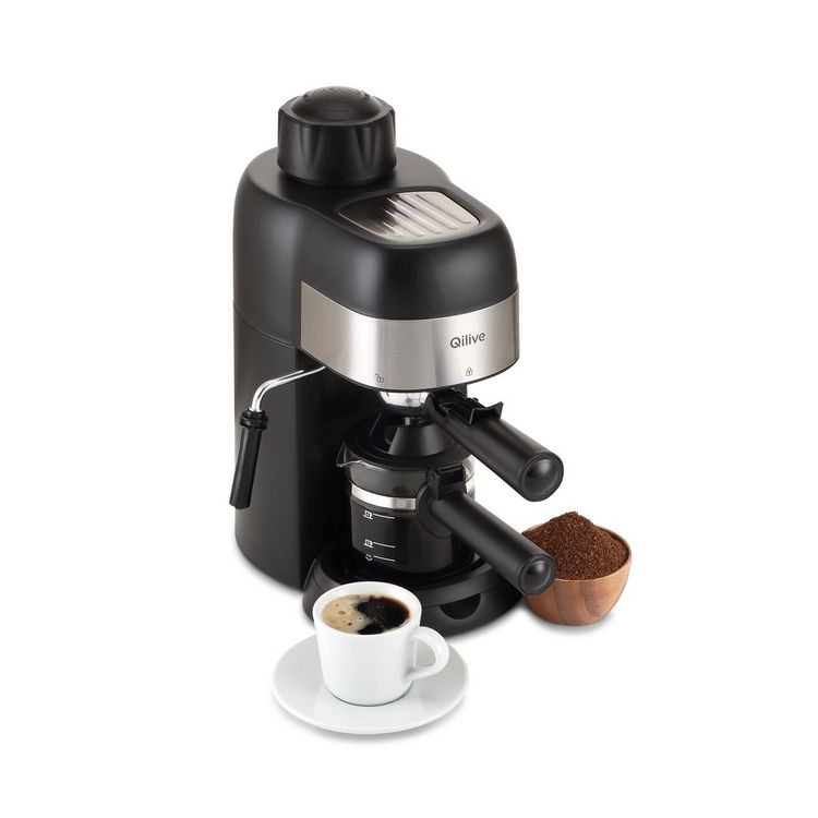 800 W, Pression 3.5 bars, Capacité 240 ml, Verseuse en verre, Percolateur et cuillère inclus, Buse vapeur, Arrêt automatique