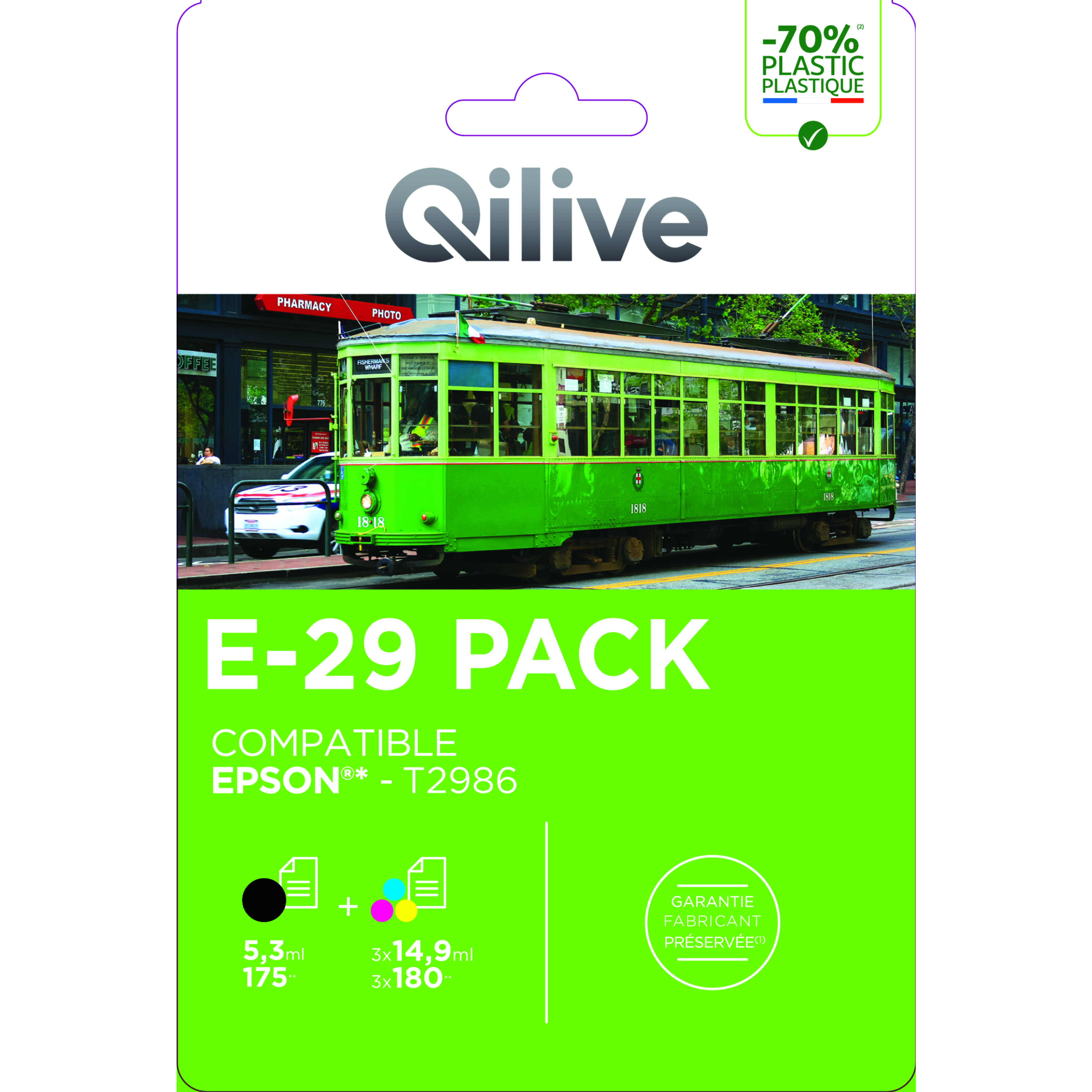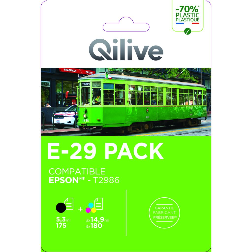 Le Pack de cartouches d'encre QILIVE Noir + Cyan + Magenta + Jaune E-29 est la solution idéale pour une qualité d'impression couleur et noir supérieure, alliant performance, fiabilité et une compatibilité parfaite pour tous vos besoins créatifs et quotidiens.