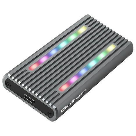 Découvrez l'enceinte SSD M.2 RGB de la marque Qoltec, un boîtier externe élégant fabriqué en aluminium de haute qualité. Compatible avec les disques SSD NVMe M-Key et SATA B+M-Key, il supporte les formats 2230, 2242, 2260, et 2280 jusqu'à une capacité de 4 To. Ce boîtier offre des vitesses de transf
