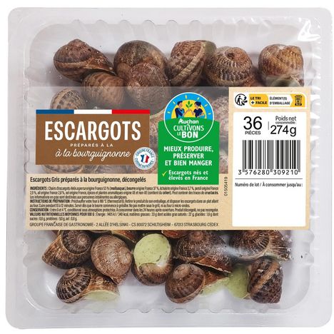 Ingrédients : Chairs d'escargots Helix aspersa origine France 53% (MOLLUSQUE), BEURRE Origine France 37%, échalote