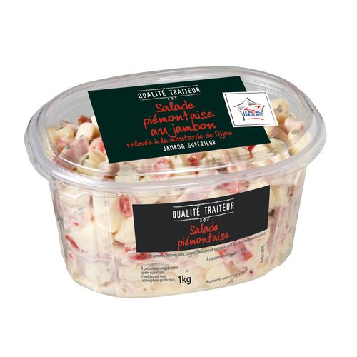 Ingrédients : Ingrédient(s): pommes de terre cuites 50%, tomate 14%, jambon cuit supérieur 12% (jambon de porc (origine : France), eau, sel, arôme naturel, sirop de glucose, antioxydant : E316, conservateur : E250), huile de colza, ŒUF dur 4%, cornichon 4% (contient affermissant : E509), eau, MOUTARDE de Dijon 1,3% (eau, graines de MOUTARDE, vinaigre d'alcool, sel), sel, vinaigre d'alcool, jaune d'OEUF, persil, sucre, amidon modifié de pomme de terre, épaississants : E412, E415.