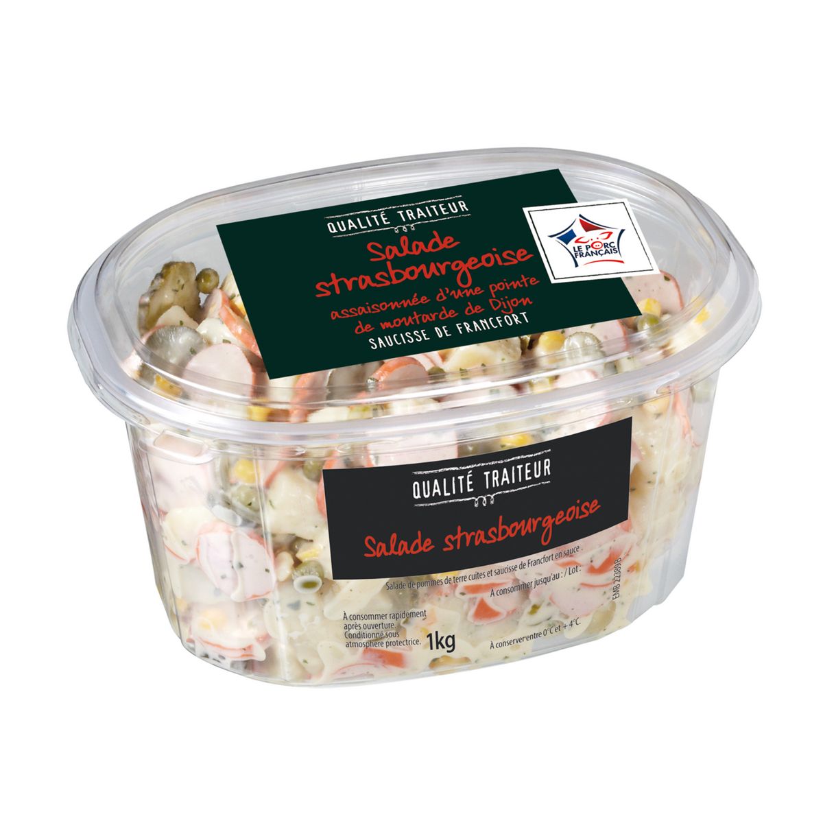 Ingrédients : Ingrédient(s): pommes de terre cuites 36%, saucisse de Francfort 26% (viande de porc (origine : France), gras de porc, eau, sel, protéine de LAIT, dextrose, épices, antioxydant : E316, conservateur : E250, boyau coloré (collagène, eau, cellulose, colorant : E172)), eau, maïs, huile de colza, petits pois, cornichon 5% (contient affermissant : E509), vinaigre d'alcool, MOUTARDE de Dijon 1,4% (eau, graines de MOUTARDE, vinaigre d'alcool, sel), sel, persil, jaune d'OEUF, amidons modifiés, sucre, épaississants : E412, E415, poivre.
