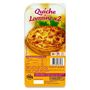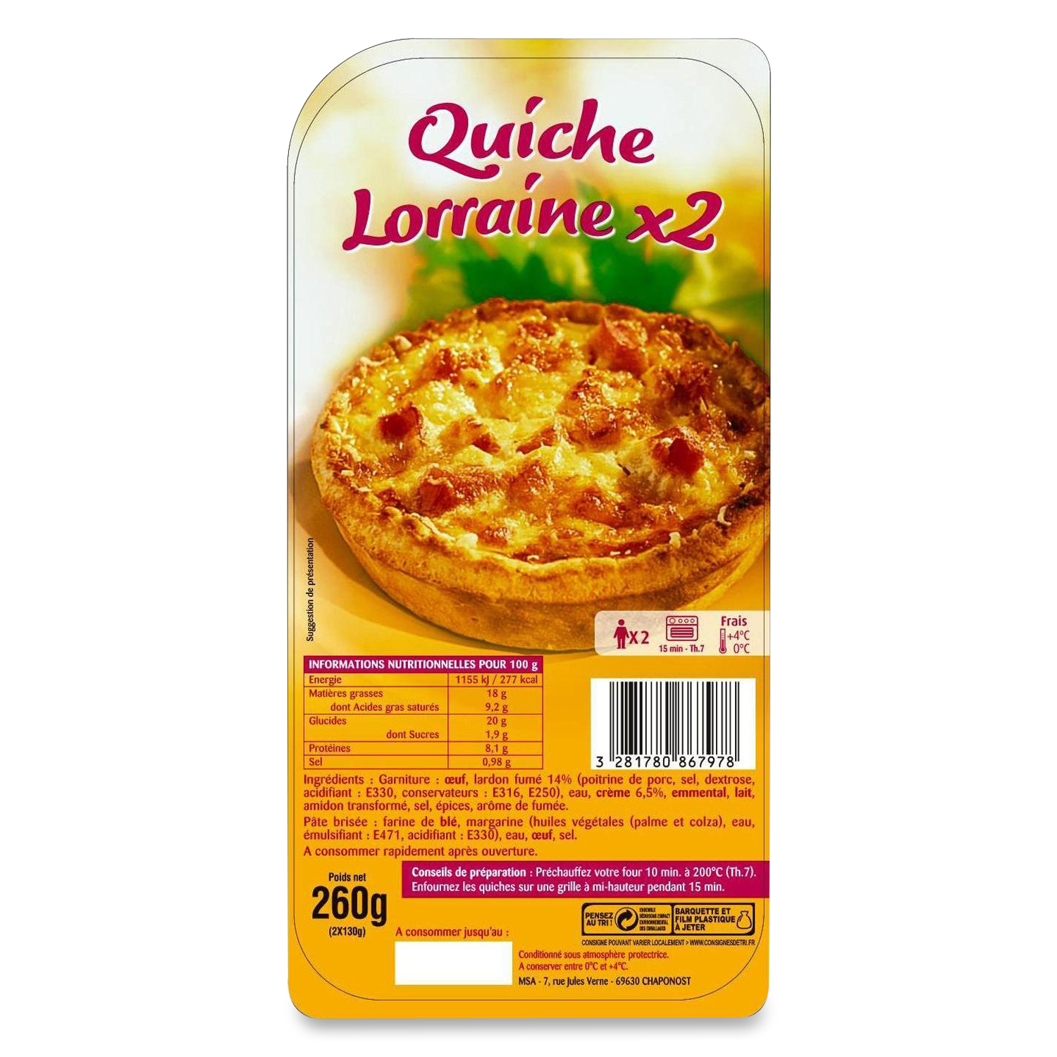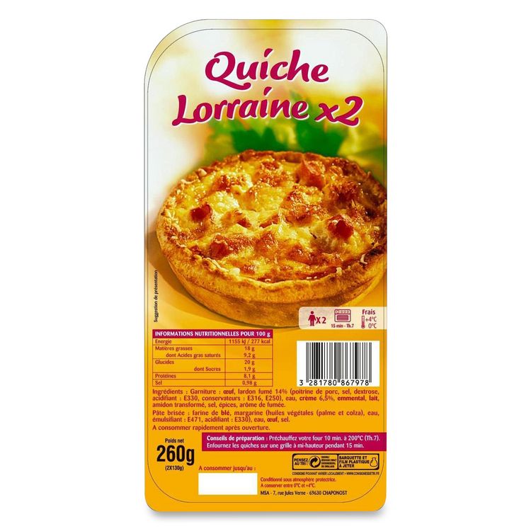 Ingrédients : Garniture : œuf, lardon fumé 14% (poitrine de porc (Origine : UE), sel, dextrose, acidifiant : E330, antioxydant : E316, conservateur : E250), eau, crème 6,5%, emmental, lait en poudre, amidon transformé, sel, épices, arôme de fumée.