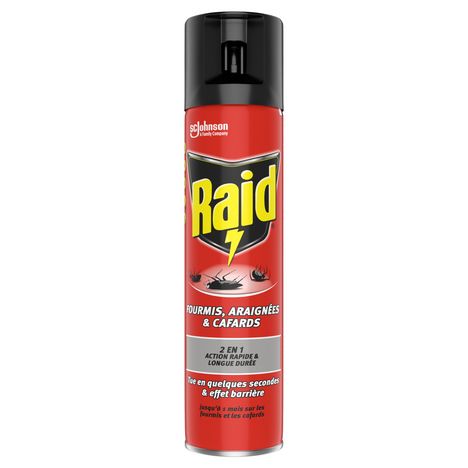 Mode d’emploi : Bien agiter avant usage. Maintenir l’aérosol droit. Diriger l’aérosol vers l’insecte rampant/araignées ou la surface à vaporiser et bien enforcer le bouton vaporisateur. Tenir à une distance d’environ 30 cm de l’insecte/araignée ou de la surface à vaporiser. Dose à respecter: 5 secondes de pulvérisation par mètre linéaire. Après chaque pulvérisation de 5 secondes, quitter la pièce et laisser agir 15 minutes puis bien aérer. Pour éliminer les insectes caches et former une barrière de protection contre l’arrivée de nouveaux insectes, (jusqu'à 4 semaines sur les fourmis et les cafards) pulvériser sur tous les lieux de passages, par exemple, sur les fissures, près des tuyauteries, des encadrements de portes et fenêtres. Ne pas vaporiser à une distance inférieure à 1 mètre des murs intérieurs, des tissus et des meubles. Pour des surfaces fragiles, faire un essai sur une partie non visible. L’aérosol Raid® Fourmis, Araignées & Cafards élimine fourmis (fourmis noires), araignées, cafards (blattes germaniques et orientales), et autres insectes rampants. Son efficacité vous garantit des résultats en quelques secondes.