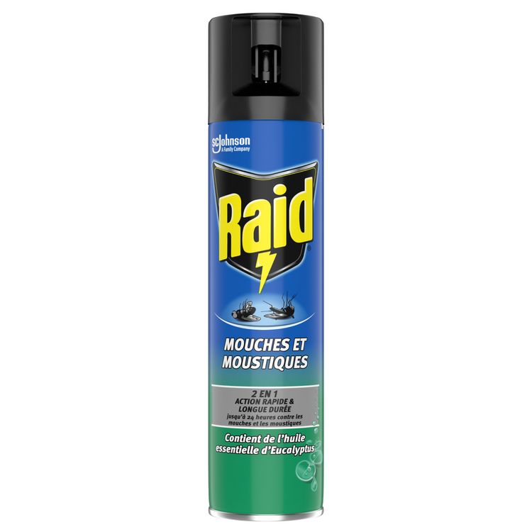 Mode d'emploi: Bien agiter avant usage. Ne pas orienter le produit en direction du visage, vaporiser en maintenant l'aérosol le plus droit possible. Avec Raid®, pas besoin de viser directement les insectes volants, le produit vaporisé en suspension va les tuer. Fermer portes et fenêtres. Pour une pièce de 12m2 (environ 30m3) vaporiser 8 à 10 secondes dans un mouvement ample en dirigeant le spray dans toutes les directions et en partant du centre de la pièce vers la porte. Ne pas vaporiser à une distance inférieure à 1 mètre des murs intérieurs, des tissus, des meubles et objets. Ne pas rester dans la pièce traitée. Laisser agir 15 minutes puis bien aérer. Pour un effet en quelques secondes (10 secondes sur les moustiques et 20 secondes sur les mouches), vaporiser directement sur les insectes y compris les guêpes et frelons errants qui pourraient entrer à l'intérieur. Pour un effet barrière résiduel, vaporiser les contours des portes et fenêtres à une distance d'environ 50 cm. Avant toute utilisation, il est recommandé de faire un essai sur une zone cachée pour prévenir tout risque de tâche ou dommage.