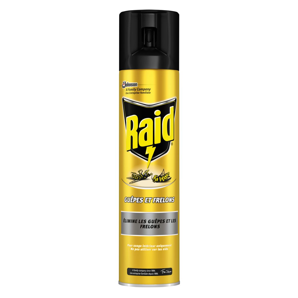 L’aérosol Raid® guêpes et frelons contient une formule permettant de tuer par contact direct les guêpes et frelons isolés, ainsi que d’autres insectes volants comme les mouches ou les moustiques. L’aérosol Raid® guêpes et frelons :
