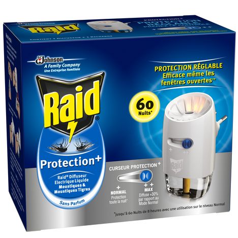 Raid Diffuseur Électrique Liquide Protection+ 60 Nuits, 1 unité Le curseur du diffuseur électrique Raid Protection+ vous permet de régler votre protection contre les moustiques et moustiques tigres afin de passer une bonne nuit.