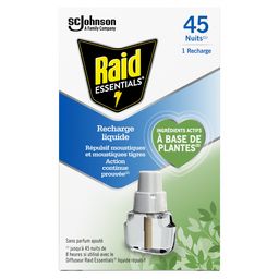 La recharge liquide Raid Essentials® pour diffuseur électrique répulsif moustiques sans parfum ajouté utilise le pouvoir des plantes* pour protéger toute votre famille*** contre les moustiques et moustiques tigres**. Sa formule avec des ingrédients actifs à base de plantes, dérivés de fleurs de chrysanthème et de feuilles d’Eucalyptus*, vous offre une protection efficace et continue* contre les moustiques et moustiques tigres, jusqu’à 45 nuits de 8 heures. Il vous suffit de brancher le diffuseur pour profiter de son efficacité.