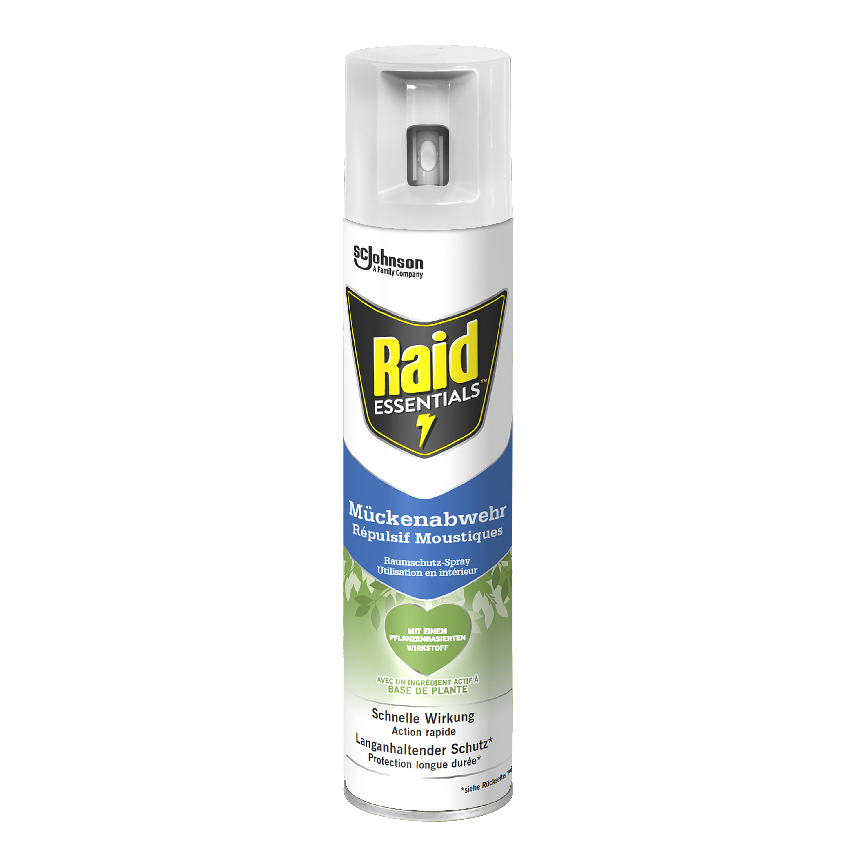 L'aérosol Répulsif Moustiques Raid Essentials™ protège votre intérieur des moustiques en continu jusqu'à 4 heures*. Il vous protège des moustiques qui pourraient se poser sur votre peau - afin qu'ils ne vous piquent pas. Sa formule contient une substance active à base de plante et ne contient pas de parfum ajouté.