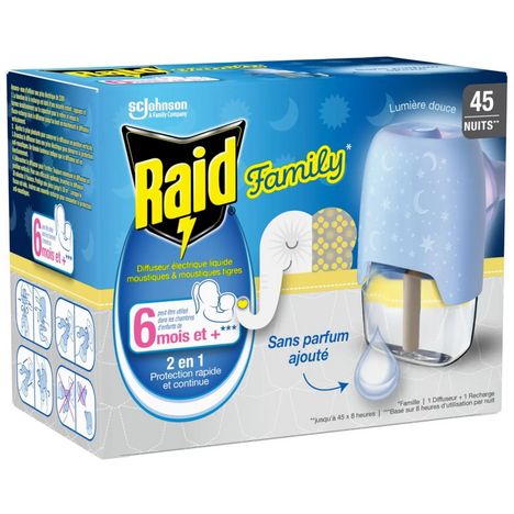 Quand les moustiques viennent perturber vos nuits et celles de votre famille, vous cherchez à vous protéger. Raid® Family* diffuseur électrique liquide vous offre la protection nécessaire contre la gêne causée par les moustiques pendant votre sommeil. Le diffuseur a été spécialement conçu pour vos enfants (6 mois et plus, basé sur 8 heures d'utilisation par nuit) afin de créer une protection continue contre les moustiques et moustiques tigres là où ils en ont le plus besoin.