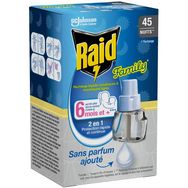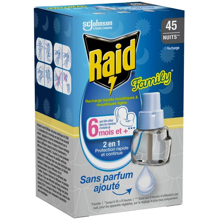 Quand les moustiques viennent perturber vos nuits et celles de votre famille, vous cherchez à vous protéger. Raid® Family* diffuseur électrique liquide vous offre la protection nécessaire contre la gêne causée par les moustiques pendant votre sommeil. Le diffuseur a été spécialement conçu pour vos enfants (6 mois et plus, basé sur 8 heures d'utilisation par nuit) afin de créer une protection continue contre les moustiques et moustiques tigres là où ils en ont le plus besoin. La recharge Raid® électrique liquide est efficace 45 nuits de 8 heures. Le niveau de liquide peut être facilement observé : quand la recharge est terminée, insérez une nouvelle recharge pour bénéficier à nouveau de 45 nuits de protection. *Famille Utilisez les produits insecticides avec précaution. Avant toute utilisation, lisez l'étiquette et les informations concernant le produit.