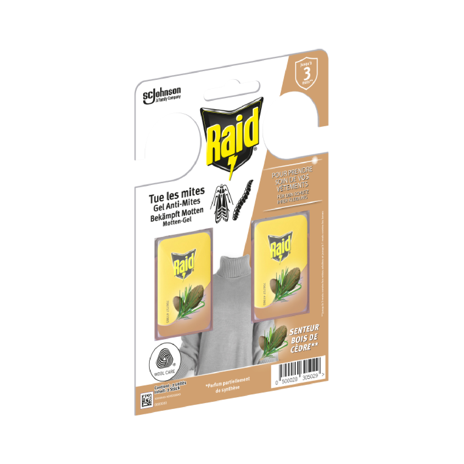 RAID® gel anti-mites senteur lavande tue les mites durant toute une saison (jusqu'à 3 mois). Parfum partiellement de synthèse. Utilisez les produits insecticides avec précaution. Avant toute utilisation, lisez l’étiquette et les informations concernant le produit. Dangereux. Respecter les précautions d’emploi.