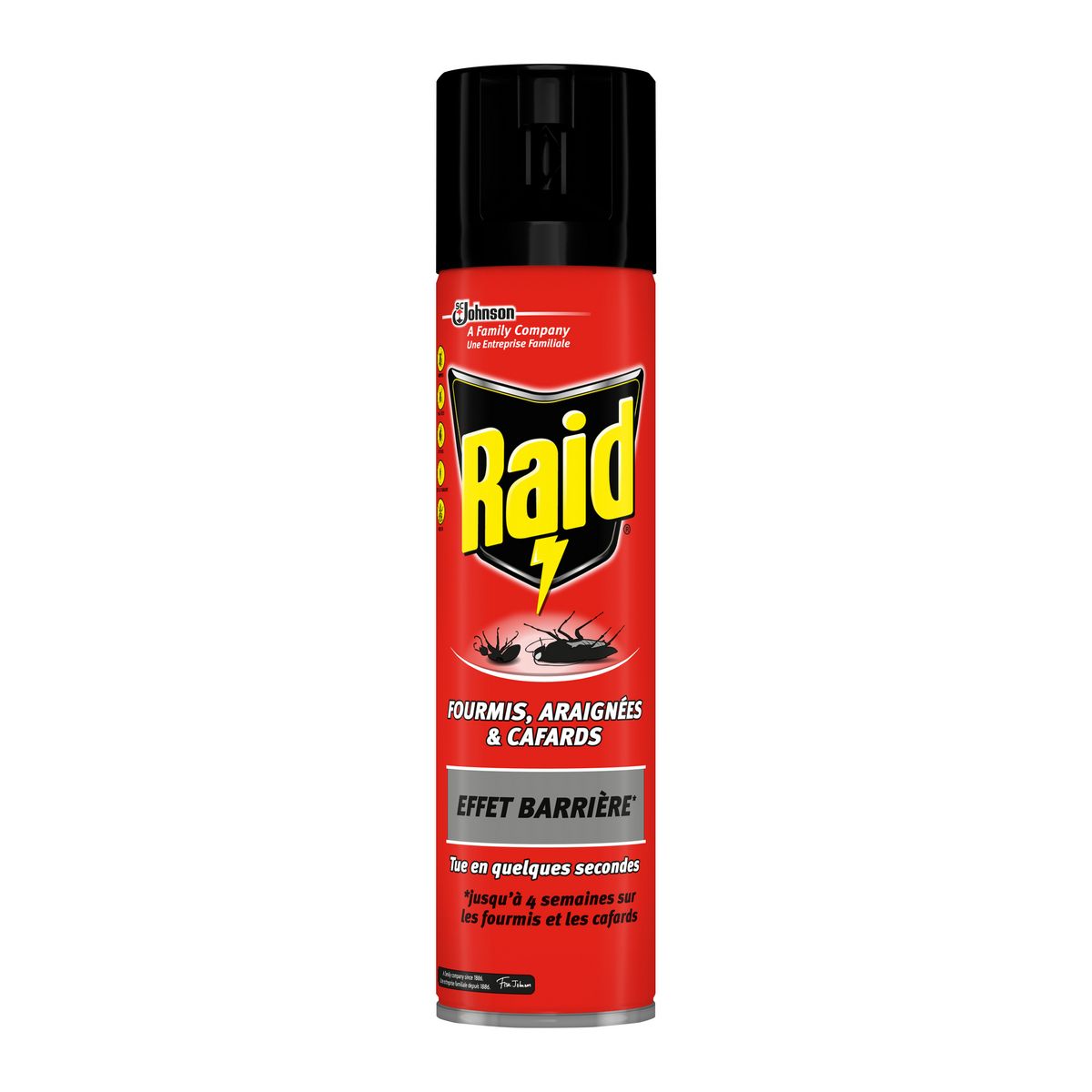 Raid® aérosol fourmis, araignées et cafards est spécialement conçu pour éliminer les fourmis, araignées, les cafards et autres insectes rampants. Sa formule agit rapidement et vous offre jusqu’à 4 semaines de protection contre les fourmis et les cafards.