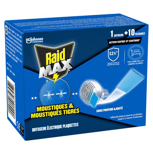 ACTION CONTINUE ET RAPIDE* : Chaque plaquette Raid Max® vous offre jusqu'à 12 heures de protection contre les moustiques communs et les moustiques tigres dans une pièce de 30m³. *Efficacité totale au bout de 30 minutes.