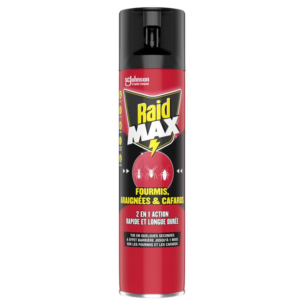L'aérosol Raid MAX® Fourmis, Araignées & Cafards élimine fourmis, araignées, cafards et autres insectes rampants. Son efficacité vous garantit des résultats en quelques secondes. Utilisez les produits insecticides avec précaution. Avant toute utilisation, lisez l'étiquette et les informations concernant le produit.