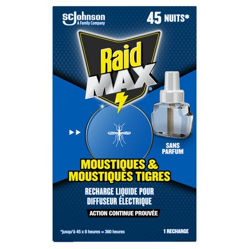 La recharge liquide pour diffuseur électrique Raid MAX® vous offre la protection nécessaire contre la gêne causée par les moustiques pendant votre sommeil. Une recharge électrique Raid MAX® protège une pièce jusqu’à 30 m3 et est efficace lumières allumées et fenêtres légèrement ouvertes. Une recharge vous assure jusqu’à 45 nuits de 8 heures de protection. Plus besoin de vaporiser ou changer de recharge chaque nuit ! Raid® vous protège efficacement vous et votre famille* contre les insectes depuis plus de 60 ans.