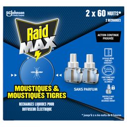 Les recharges liquides pour diffuseur électrique Raid MAX® vous offrent la protection nécessaire contre la gêne causée par les moustiques pendant votre sommeil. Une recharge électrique Raid MAX® protège une pièce jusqu’à 30 m3 et est efficace lumières allumées et fenêtres légèrement ouvertes. Une recharge vous assure jusqu’à 60 nuits de 8 heures de protection. Plus besoin de vaporiser ou changer de recharge chaque nuit ! Raid® vous protège efficacement vous et votre famille* contre les insectes depuis plus de 60 ans.