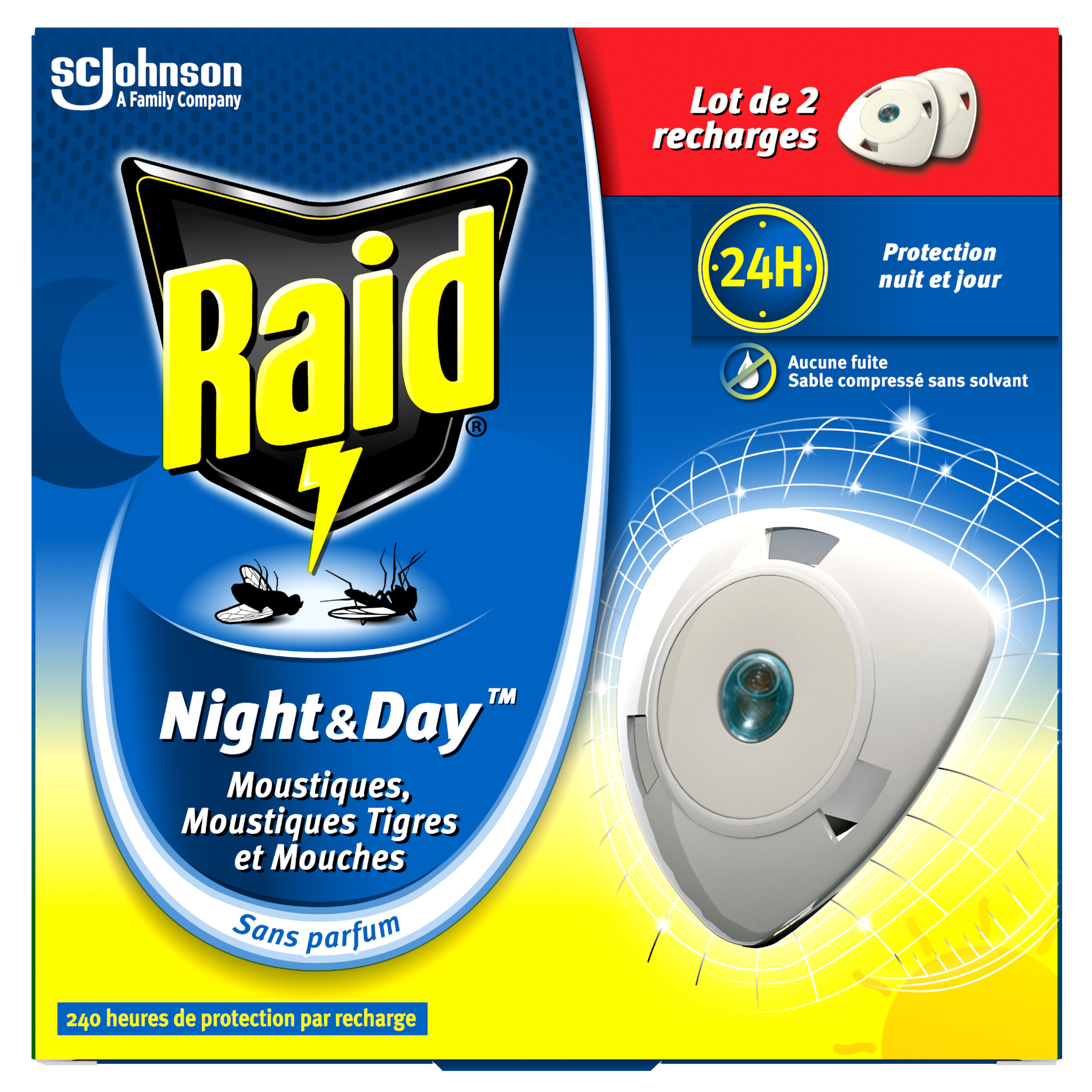 Les recharges du diffuseur électrique liquide Raid® Night & Day™ vous procurent la protection nécessaire contre la gêne causée par les moustiques, les moustiques tigres et les mouches, de jour comme de nuit. Une recharge vous assure jusqu'à 240 heures de protection. La technologie de sable compressé sans solvant garantit une protection sans aucune fuite.
