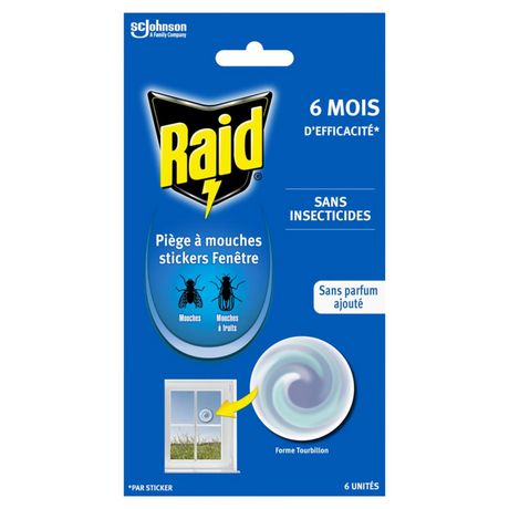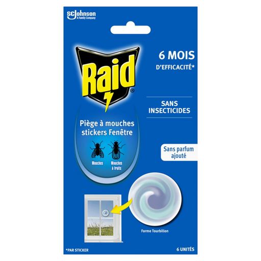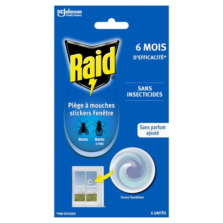 Le piège à mouches - stickers fenêtre Raid® attrape les mouches efficacement dans tous les types de pièces et fonctionne jusqu'à 6 mois. Attirées par la chaleur et la lumière, les mouches aiment être proche des fenêtres et sont ainsi piégées sur la surface collante du piège. Le piège peut aussi attraper les mouches à fruits lorsqu'il est placé à près de la zone d'infestation (par exemple, des corbeilles de fruits). Grâce à leur forme adhésive et décorative, les pièges à mouches - stickers fenêtre Raid® peuvent être utilisés dans la cuisine, où les mouches sont généralement concentrées, ainsi que dans toutes les autres pièces de votre maison. Ils sont également sans parfum et peuvent être facilement retirés.