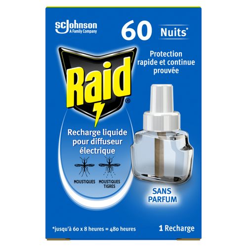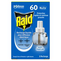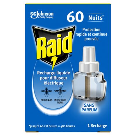 Une recharge électrique Raid® protège une pièce jusqu'à 30 m3 et vous assure jusqu'à 60 nuits de 8 heures de protection. Plus besoin d'utiliser un aérosol ou de changer de recharge chaque nuit. Sa formule est efficace même les fenêtres légèrement ouvertes et la lumière allumée. Utilisez les produits insecticides avec précaution. Avant toute utilisation, lisez l'étiquette et les informations concernant le produit. Dangereux. Respecter les précautions d'emploi.