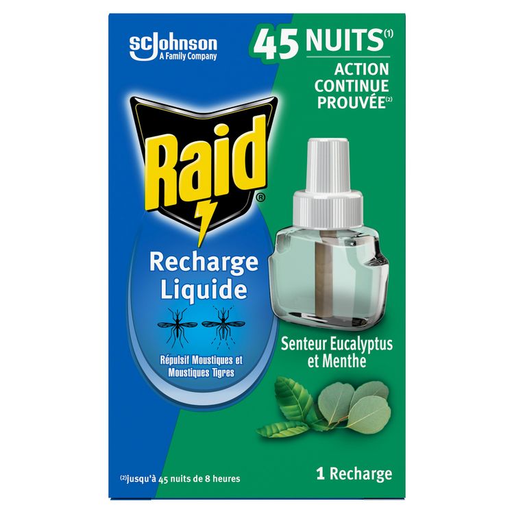 Ne laissez plus les moustiques gâcher vos nuits ! Repoussez-les avec la recharge liquide Raid®, la solution efficace pour des nuits sereines, sans la nuisance des moustiques ! Le diffuseur électrique liquide répulsif senteur Eucalyptus et Menthe Raid® offre une protection contre les moustiques et les moustiques tigres. Sa formule offre une action continue prouvée* jusqu'à 45 nuits de 8 heures. *Efficacité testée en laboratoire sur l’inhibition d’atterrissage des moustiques et moustiques tigres (Culex et Aedes Albopictus). Utilisez les produits répulsifs avec précaution. Avant toute utilisation, lisez l’étiquette et les informations concernant le produit.