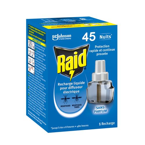Une recharge électrique Raid® protège une pièce jusqu'à 30 m3 et vous assure jusqu'à 45 nuits de 8 heures de protection. Plus besoin d'utiliser un aérosol ou de changer de recharge chaque nuit. Sa formule est efficace même les fenêtres légèrement ouvertes et la lumière allumée. Utilisez les produits insecticides avec précaution. Avant toute utilisation, lisez l'étiquette et les informations concernant le produit. Dangereux. Respecter les précautions d'emploi.