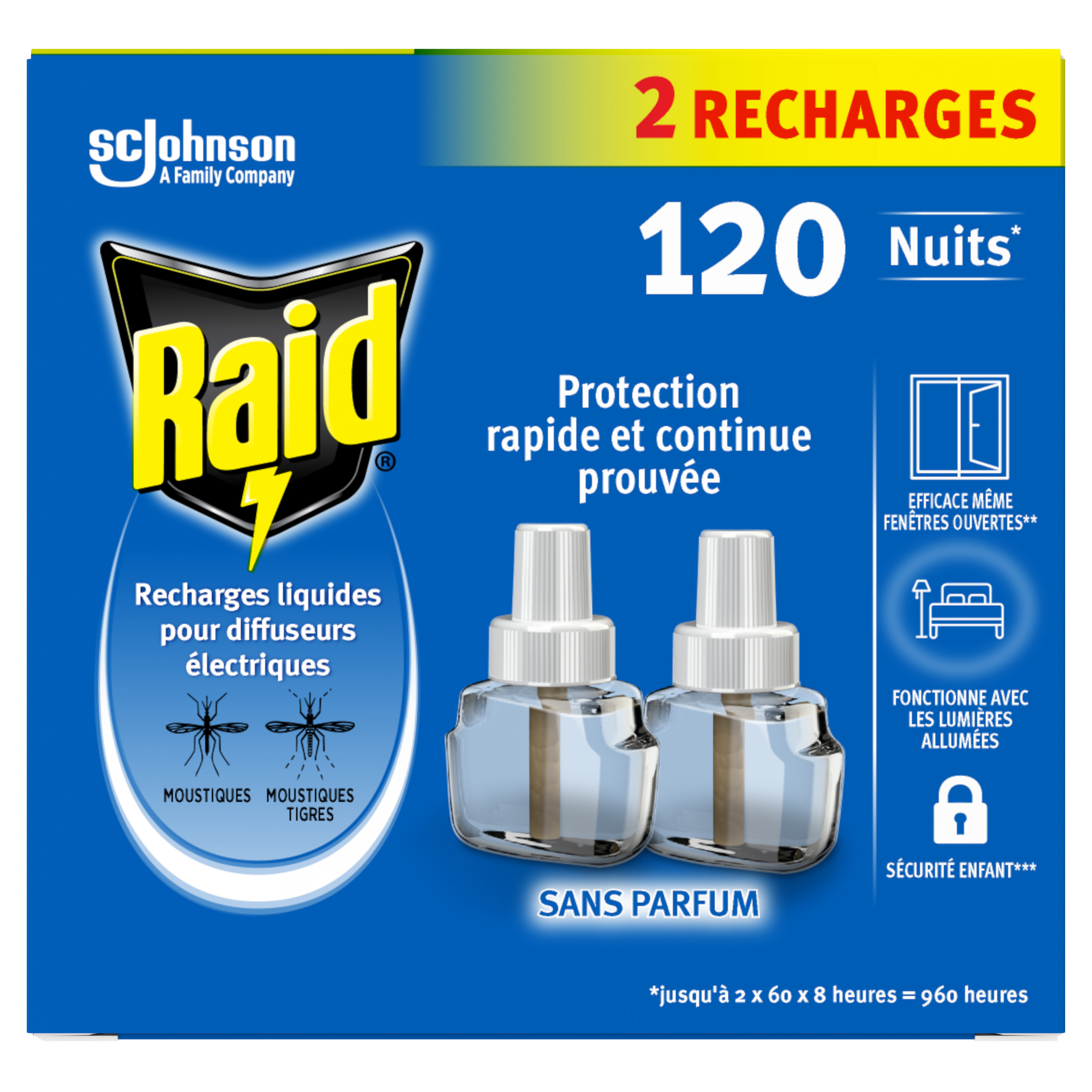 Une recharge électrique Raid® protège une pièce jusqu'à 30 m3 et vous assure jusqu'à 60 nuits de 8 heures de protection. Plus besoin d'utiliser un aérosol ou de changer de recharge chaque nuit. Sa formule est efficace même les fenêtres légèrement ouvertes et la lumière allumée. Utilisez les produits insecticides avec précaution. Avant toute utilisation, lisez l'étiquette et les informations concernant le produit. Dangereux. Respecter les précautions d'emploi.