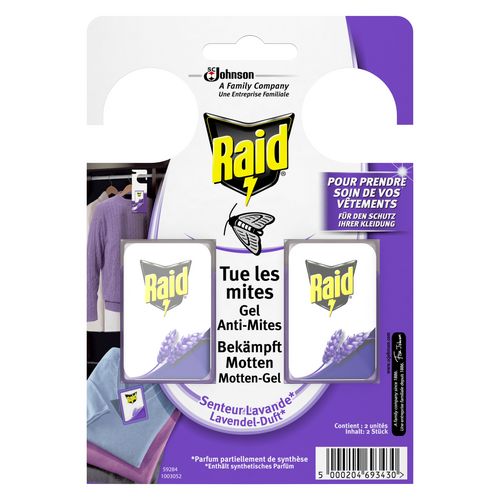 RAID® gel anti-mites senteur lavande tue les mites durant toute une saison (jusqu'à 3 mois).