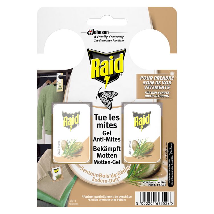 4) Placer le nombre d'unités adapté dans une penderie ou un placard, ou les poser dans un tiroir ou toute autre surface plane. Éviter tout contact direct de la matière active avec les vêtements, les tissus ou matériaux plastiques. Il est recommandé d'utiliser 2 unités dans une penderie de 0,5m3. Remplacer le produit en fin de saison ou quand le gel est sec et que le parfum s'est atténué. Pour une efficacité maximale, garder les placards et les tiroirs fermés.