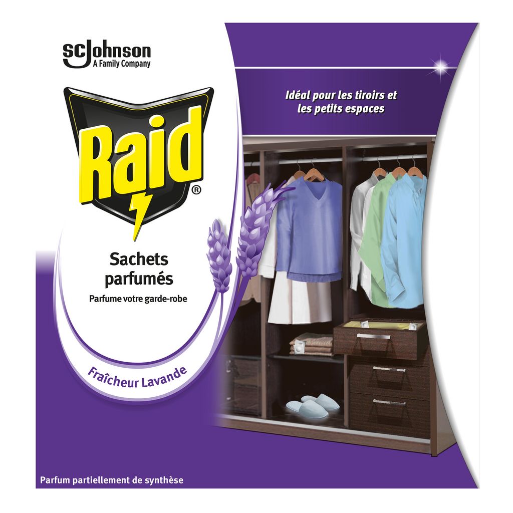 1 Ne pas ouvrir les sachets individuels. 2 Pour les petits espaces (tiroirs), placer 3 à 4 sachets. Pour les espaces plus grands, utiliser une douzaine de sachets pour 0,5m³. Pour de meilleurs résultats, limitez autant que possible les accès aux espaces où vous avez placé les sachets. 3 Placer les sachets à différents endroits de vos tiroirs et armoires. 4 Le contenu des sachets parfumés Raid ne fond pas.