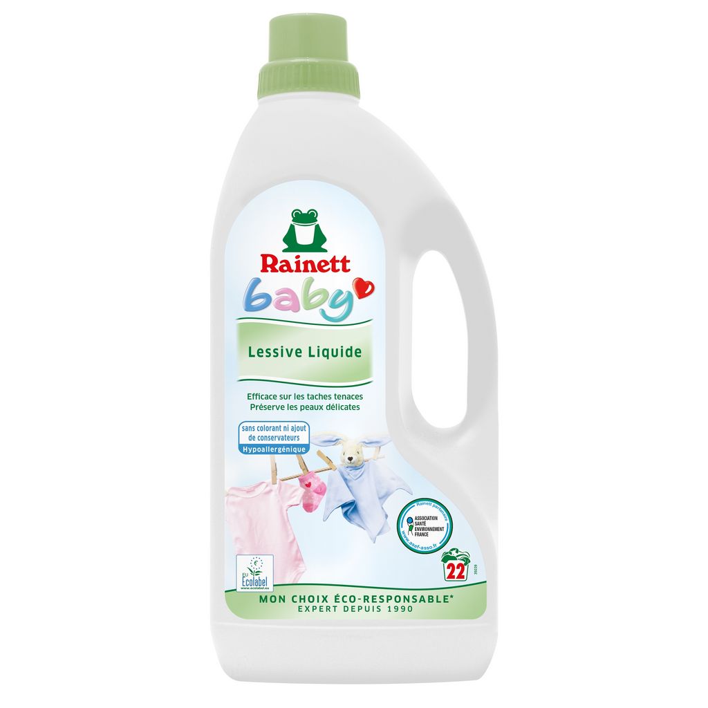 Rainett Baby lessive spécialement développée pour répondre aux besoins des bébés, enfants ou personnes souffrant d'allergies tout en enlevant les tâches les plus tenaces.