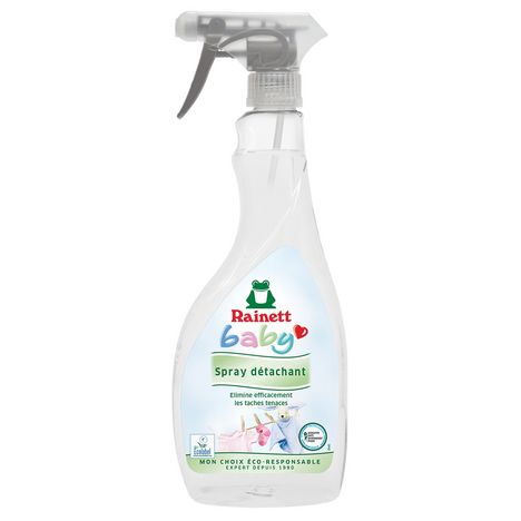 Rainett Baby Spray détachant Ecolabel 500ml permet de désincruster les taches tenaces faites par bébé tout en respectant ses vêtements et sa peau délicate.