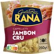 Première création de la Maison Rana, c'est la star des recettes Giovanni Rana. Les Cappelletti Jambon Cru révèlent ici tout de leur goût, dans une farce dévoilant encore plus la finesse du roi de la charcuterie italienne. Elle séduit toute la famille par son goût riche, sa petite forme et ses multiples utilisations, pour des repas simples et rapides.