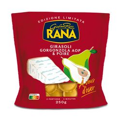 Ingrédients : Farce 60% : fromage ricotta (sérum de lait, lait, sel), fromage Gorgonzola AOP* 12%, poire déshydratée (poire, amidon) 12%, crème (contient du lait), fromage mascarpone, sérum de lait en poudre, beurre, chapelure (farine de blé tendre, eau, sel, levure), sel, fibres végétales (maïs et pommes de terre), amidons, arômes naturels (contiennent lait, blé, orge).