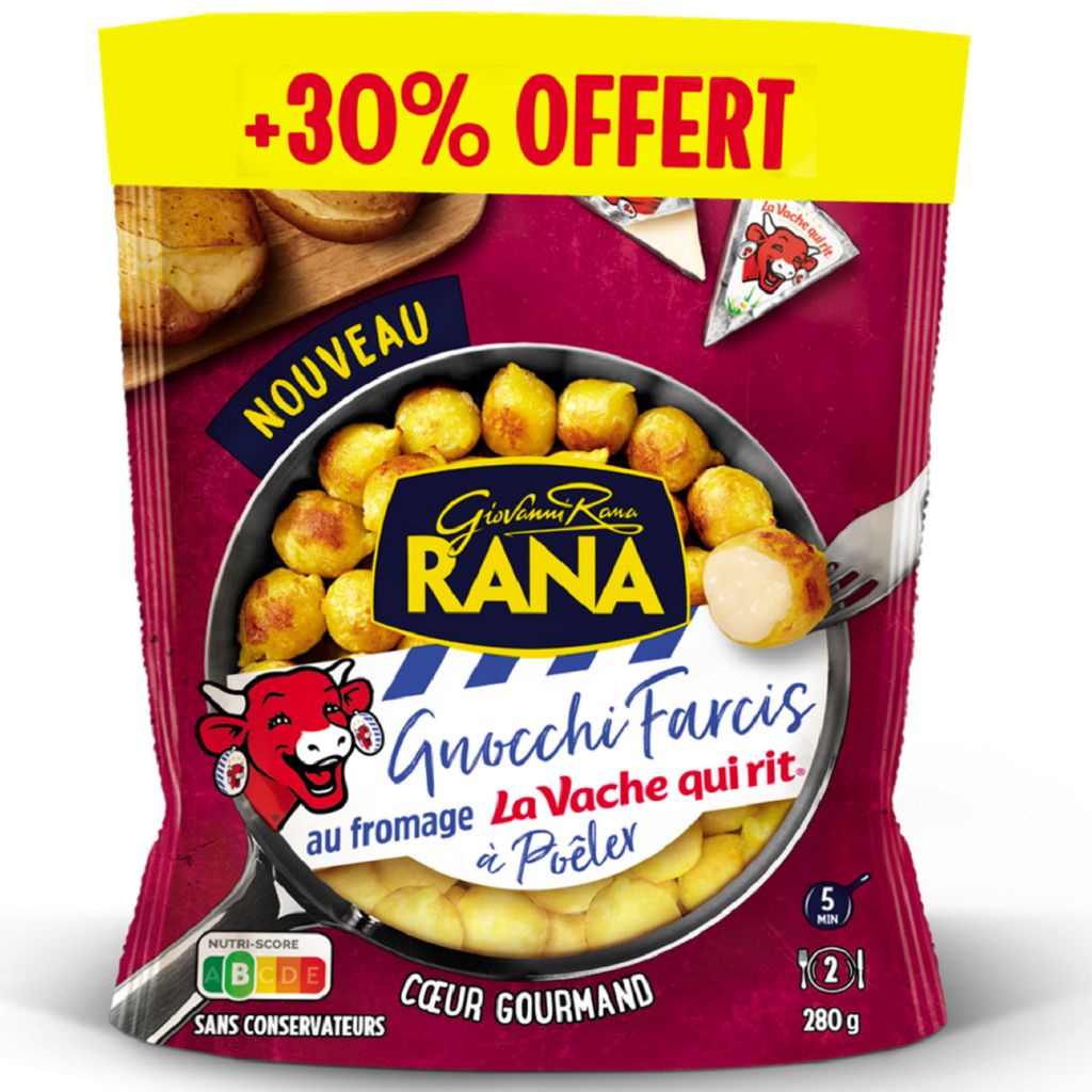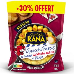 Ingrédients : Pâtes à gnocchi 70% : purée de pommes de terre 61% (eau, flocons de pommes deterre), semoule de BLÉ dur, sel, huile de tournesol, curcuma.Farce 30% : FROMAGE "La vache qui rit" 50% (LAIT écrémé réhydraté, FROMAGES,BEURRE, protéines de LAIT, concentré de minéraux LAITIERS, sels de fonte : polyphosphates, concentré LACTIQUE LAITIER), ricotta (sérum de LAIT, LAIT, CRÈME, sel), FROMAGE râpé, sérum de LAIT en poudre, fibre végétale, chapelure (farine de BLÉtendre, eau, sel, levure), flocons de pomme de terre, sel, arômes naturels (contiennent LAIT, BLÉ).