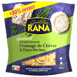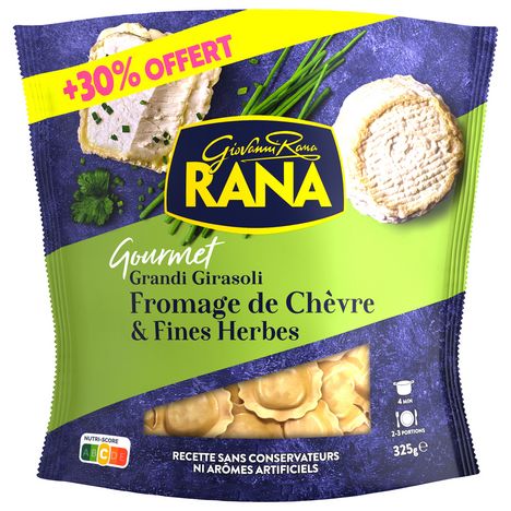 Ingrédients : Farce 63% : ricotta (sérum de lait, lait, sel), fromage de chèvre 9%, huile de tournesol, fibres végétales (maïs et pommes de terre), crème (contient du lait), fromage mozzarella, chapelure (farine de blé tendre, eau, sel, levure), amidons, fromage mascarpone, sérum de lait en poudre, fromage râpé, ail, persil 1%, ciboulette 0.7%, poivre noir, ail en poudre, sel, arômes naturels (contiennent orge et lait).Pâte 37% : farine de blé tendre, œufs 30%, semoule de blé dur.