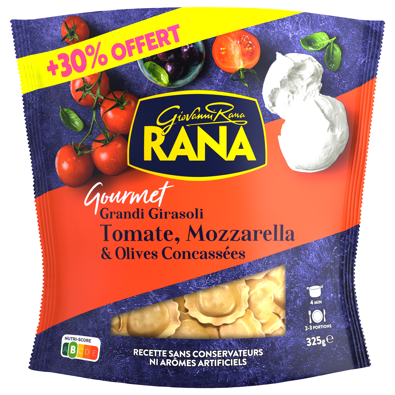 Ingrédients : Farce 63% : fromage mozzarella 17%, ricotta (sérum de lait, lait, sel), tomate 13%, olives noires 11%, fibres végétales (maïs et pommes de terre), huile de tournesol, chapelure (farine de blé tendre, eau, sel, levure), amidons, tomates en morceaux 4%, concentré de tomates 4%, lait écrémé en poudre, tomate en poudre 1.5%, beurre, basilic 1%, sel, arômes naturels (contiennent lait, blé), oignons, correcteur d'acidité : bicarbonate de sodium.Pâte 37% : farine de blé tendre, œufs 30%, semoule de blé dur.