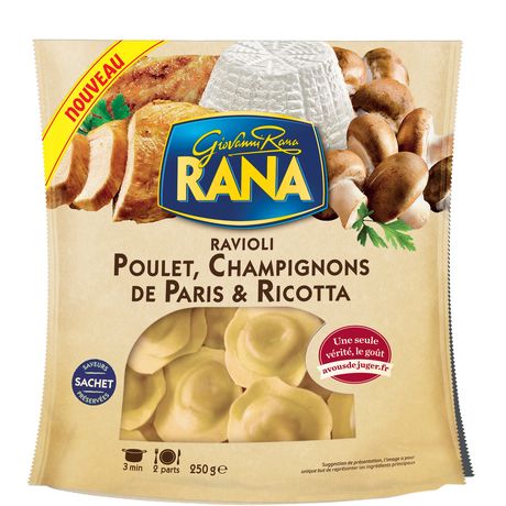 Ingrédients : Farce 52%: poulet 21%, ricotta (serum de LAIT, LAIT, sel), champignon de Paris 13% (Agaricus bisporus), FROMAGE mozzarella, CREME, BEURRE, fibres vegetales, aromes naturels (contiennent LAIT, GLUTEN), serum de LAIT en poudre, chapelure (contient GLUTEN), amidons, Champignon deshydratés (Agaricus bisporus) 1,4%, LAIT ecremé en poudre, LACTOSE, sel, hiule de turnesol, sucre, oignon, ail en poudre, poivre. Pâte 48%: farine de BLE tendre, ŒUFS 30%, semoule de BLE dur.