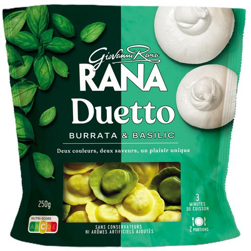 Farce 52% : FROMAGE ricotta (sérum de LAIT, LAIT, sel), FROMAGE mozzarella, FROMAGE burrata 8%, CRÈME (contient du LAIT), FROMAGE mascarpone, LACTOSE, huile de tournesol, BEURRE, LAIT écrémé en poudre, chapelure (farine de BLÉ tendre, eau, sel, levure), amidons, fibres végétales (maïs et pommes de terre), sel, arômes naturels.