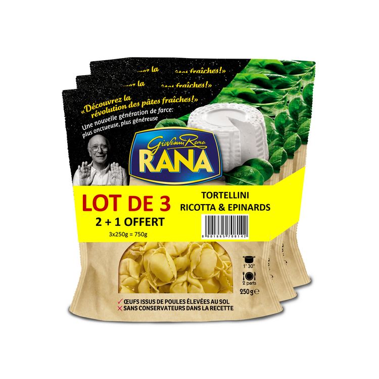 Ingrédients : Farce 53%: épinards 25%, ricotta 18% (sérum de LAIT, LAIT, sel), chapelure (farine de BLÉ tendre, eau, sel, levure), fibres végétales, CRÈME, FROMAGE mascarpone, huile de tournesol, FROMAGE Parmigiano Reggiano, BEURRE, sérum de LAIT en poudre, amidons, sel, arômes naturels (contiennent LAIT, ORGE et BLÉ), sucre, ail.Pâte 47%: farine de BLÉ tendre, ŒUFS 30%, semoule de BLÉ dur.