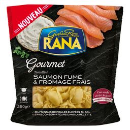 Ingrédients : Farce 53%: ricotta (sérum de LAIT, LAIT, sel), SAUMON fumé 21% (SAUMON Salmon Salar, sel), fibres végétales, CREME, huile de tournesol, amidons, chapelure (farine de BLE tendre, eau, sel, levure), FROMAGE mascarpone 4,7%, FROMAGE Parmigiano Reggiano, BEURRE, sel, persil, poudre de tomates, arômes naturels (contiennent BLE et ORGE).Pâte 47%: farine de BLE tendre, OEUFS 30%, semoule de BLE dur.