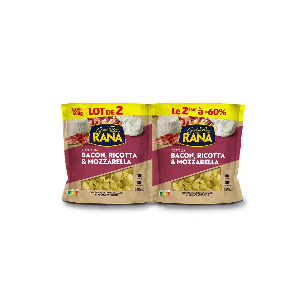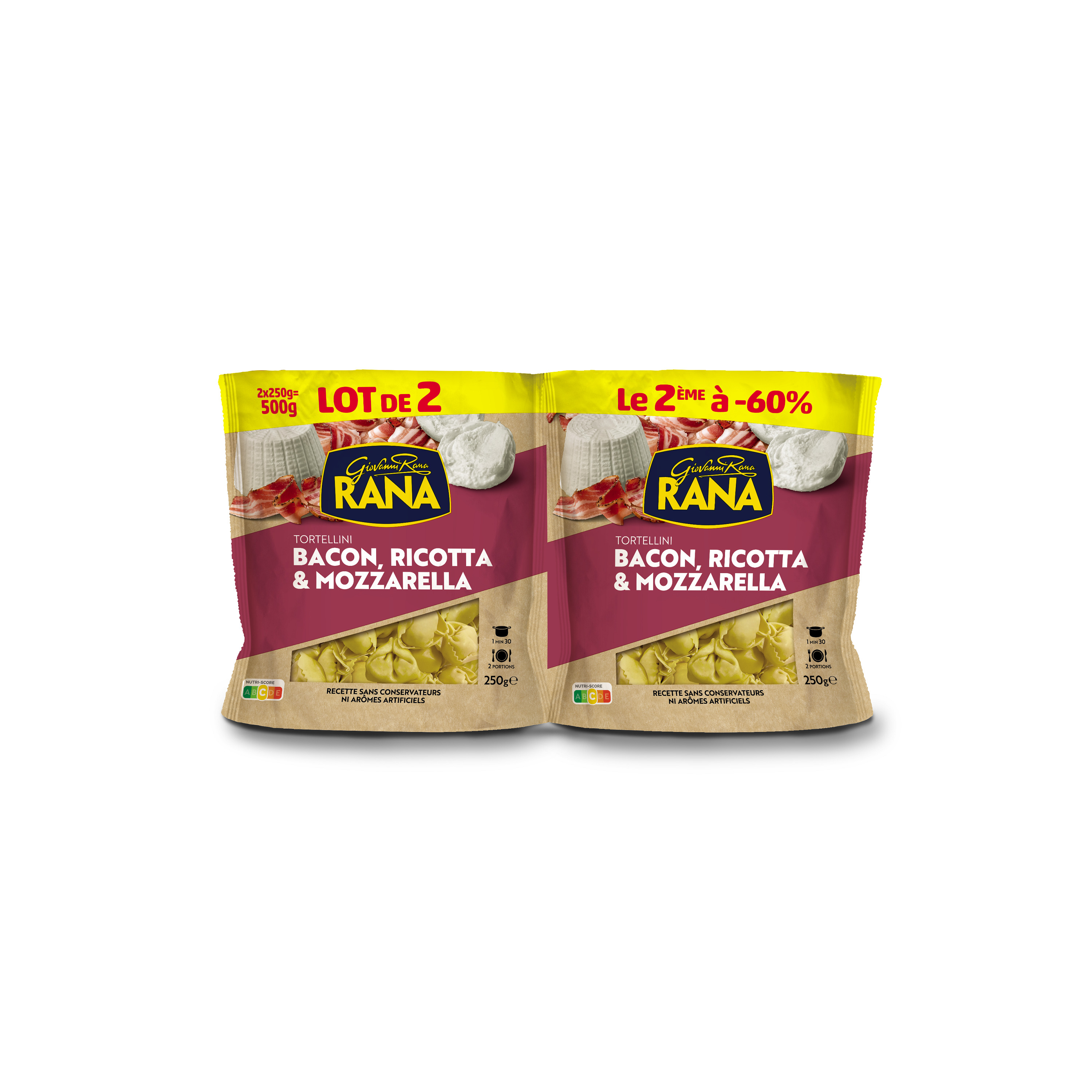 Ingrédients : Farce 53% : ricotta 30% (sérum de lait, lait, sel), lard fumé 22% (viande de porc, sel, arômes naturels), fromage mozzarella 13%, fibres végétales (maïs et pommes de terre), crème (contient du lait), fromage Parmigiano Reggiano 6%, fromage mascarpone 5%, arômes naturels (contiennent du lait), amidon, sel, lait écrémé en poudre.Pâte 47% : farine de blé tendre, œufs 30%, semoule de blé dur.
