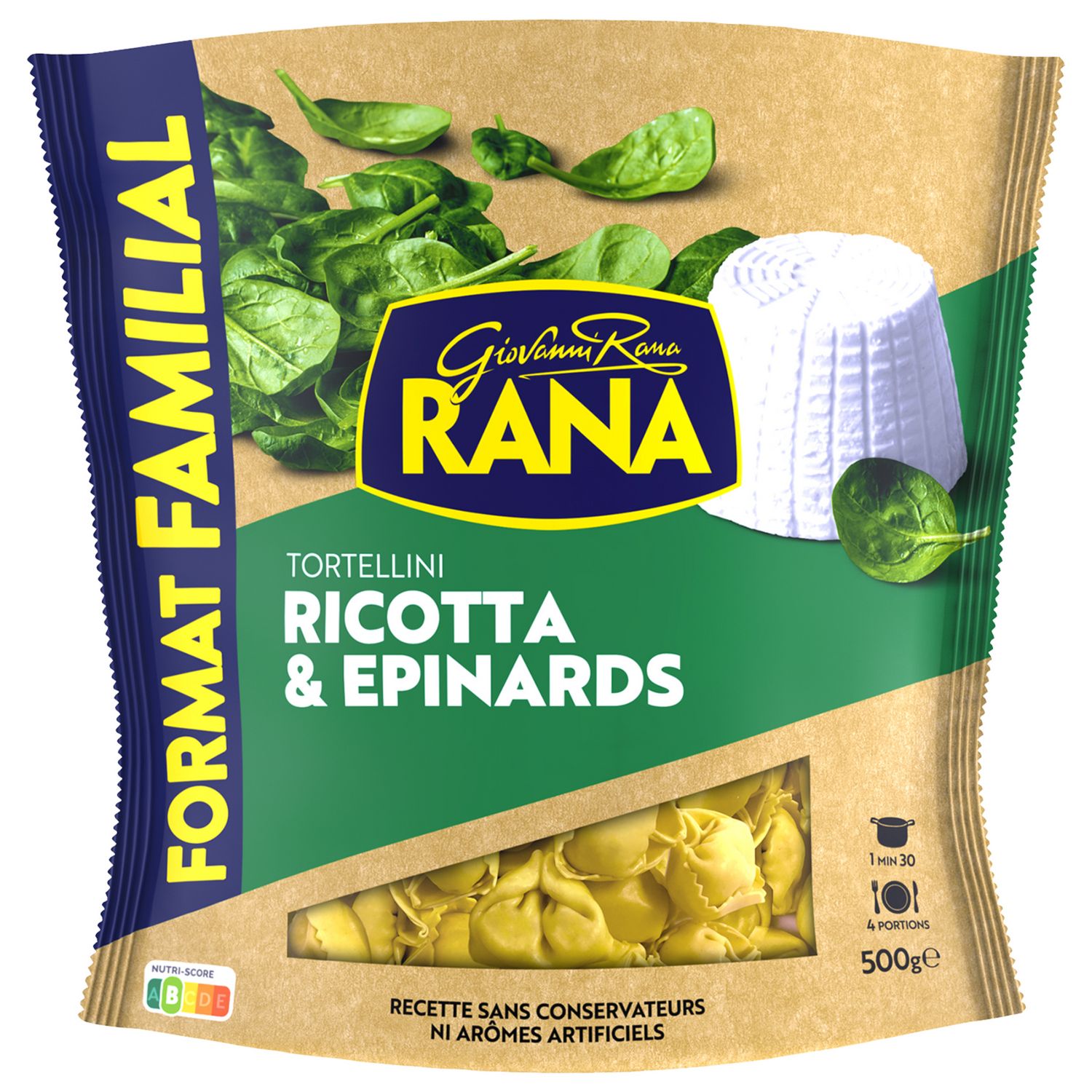 Ingrédients : Farce 53% : ricotta 35% (sérum de lait, lait, sel), épinards 20%, fibres végétales (maïs et pomme de terre), huile de tournesol, chapelure (farine de blé tendre, eau, sel, levure), sérum de lait en poudre, fromage mascarpone, amidons, flocons de pomme de terre, ail, noix de muscade, arômes naturels (contiennent lait, blé), sel.