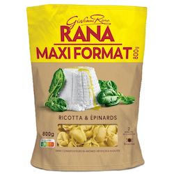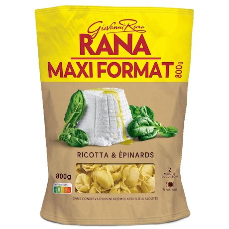 Ingrédients : Farce 53% : FROMAGE ricotta 39% (sérum de LAIT, LAIT, sel), épinards 20%, sérum de LAIT en poudre, huile de tournesol, chapelure (farine de BLÉ tendre, eau, sel, levure), FROMAGE mascarpone, amidons, fibres végétales (maïs et pommes de terre), flocons de pommes de terre, arômes naturels, sel, ail, noix de muscade.