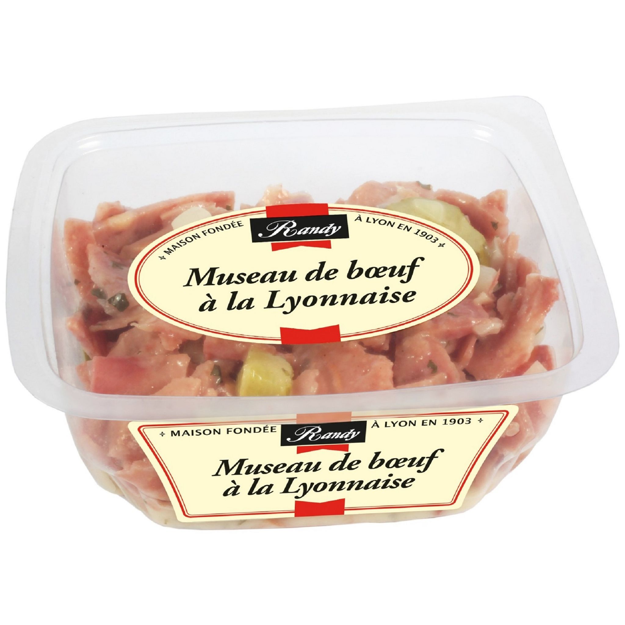 Ingrédients : Ingrédients : museau de bœuf 60% (pièces de tête de bœuf, eau, vinaigre d'alcool, betterave en poudre, sel, dextrose, sucre, acidifiants : E330, acide lactique, antioxydants : E316, acide ascorbique, conservateur : E250), eau, oignons, cornichons, huile de colza, épices, moutarde (eau, graines de moutarde, vinaigre d'alcool, sel), vinaigre d'alcool, sel, amidon transformé, épaississant : gomme xanthane.