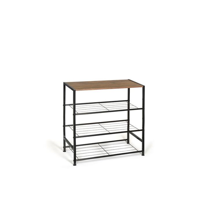 Etagère range chaussures Dimensions: 63x30x60cm Matière: métal et panneaux de particules Coloris: bois effet vieilli et noir A monter soi-même: oui Dispose de 3 étagères de rangement en métal + 1 étagère en bois Capacité: jusqu'à 9 paires de chaussures