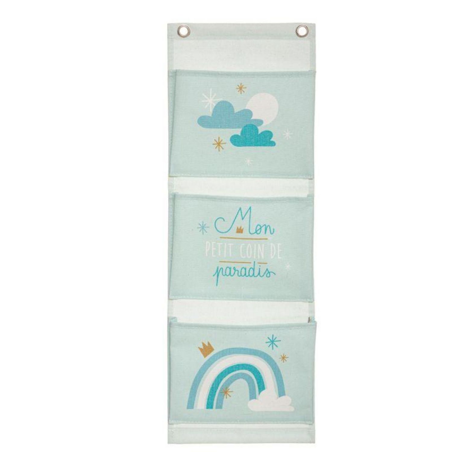 Informations Techniques : Dimensions : L. 55 x l. 0,3 x H. 18,5 cm Matières : Coton & Polyester Spécificités : Efficace & Pratique Rangement pour Enfant 3 Compartiments Forme Rectangulaire A Motifs Facile d'utilisation & d'entretien Poids : 0,08 kg Couleur : Bleu