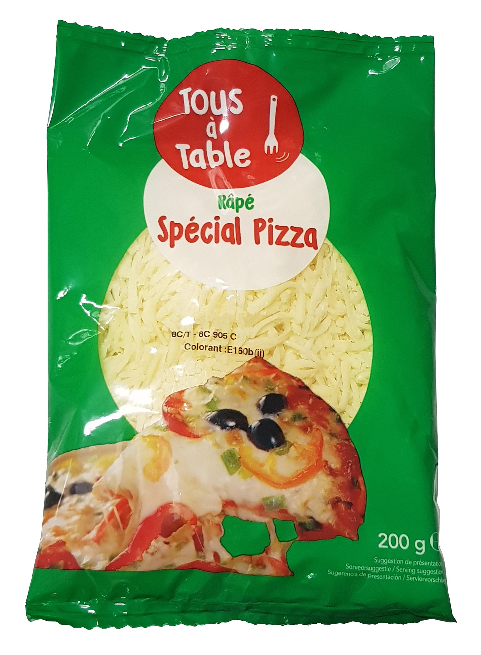 Râpé Pizza - Mélange de fromages râpés : Mozzarella (fromage à pâte filée), Fromage à pâte pressée non cuite, Emmental (fromage à pâte pressée cuite).